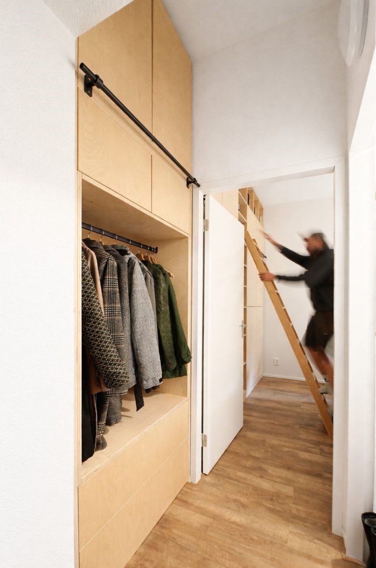 To engage with the full height of the space, we integrated a custom library ladder that not only serves the upper storage but extends seamlessly into the hallway. This gesture transforms a functional element into a spatial connector, linking rooms while accentuating the verticality of the interior. The result is a continuous architectural language—calm, tactile, and deeply rooted in craftsmanship.