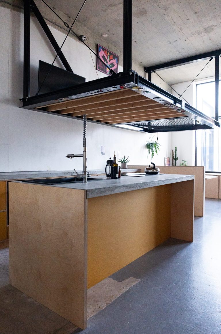 To make the most of the vertical space, we designed suspended platforms, creating a dynamic, multi-level layout while maintaining the openness of the loft. The platforms harmonize with the industrial character of the building, offering an elegant solution for defining distinct zones within the space.